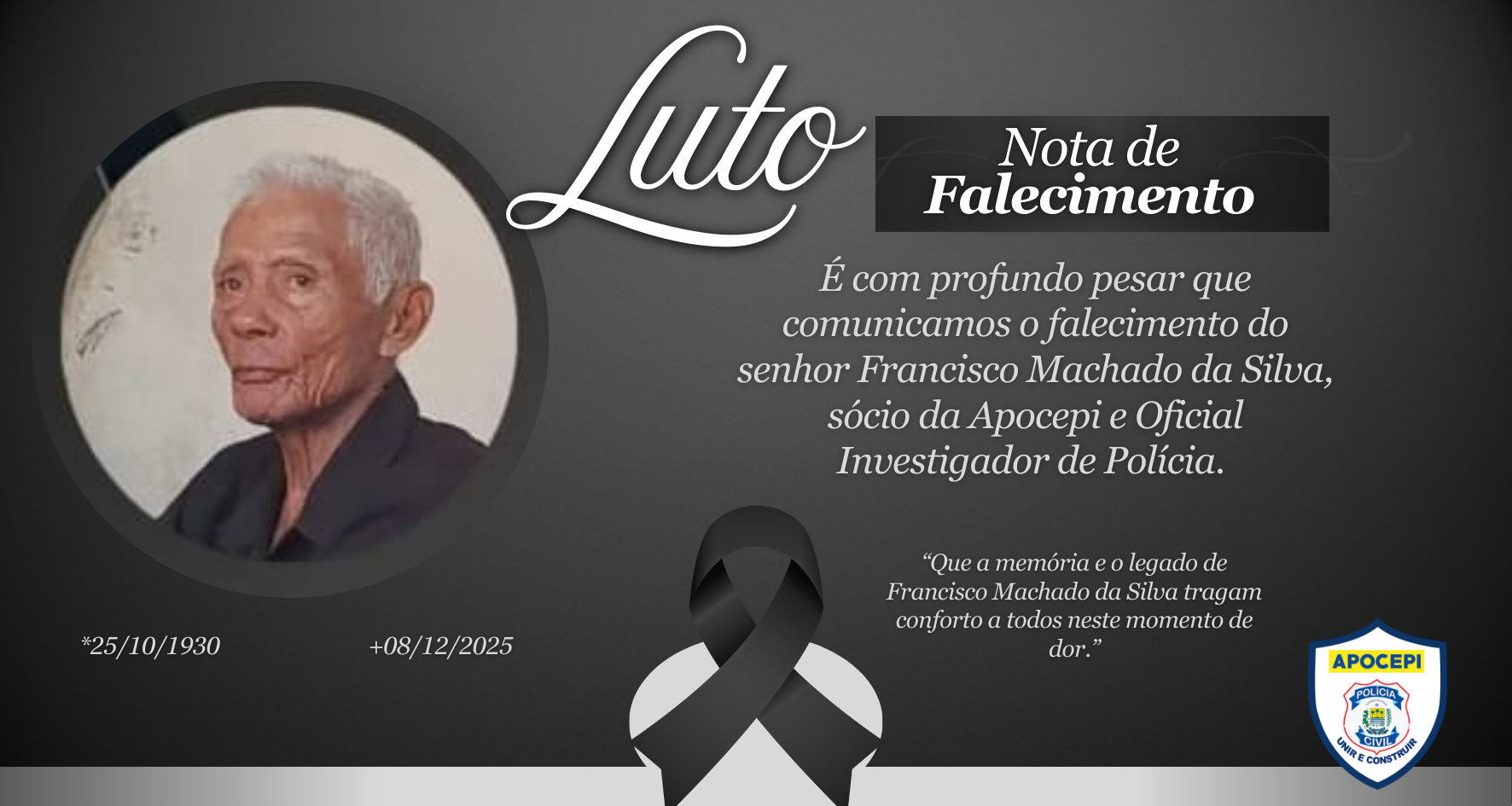 É com profundo pesar que comunicamos o falecimento do senhor Francisco Machado da Silva, sócio da Apocepi e Oficial Investigador de Polícia. Sua partida, ocorrida neste dia 08 de dezembro, deixa um profundo sentimento de tristeza entre todos que tiveram a honra de conviver e trabalhar ao seu lado.