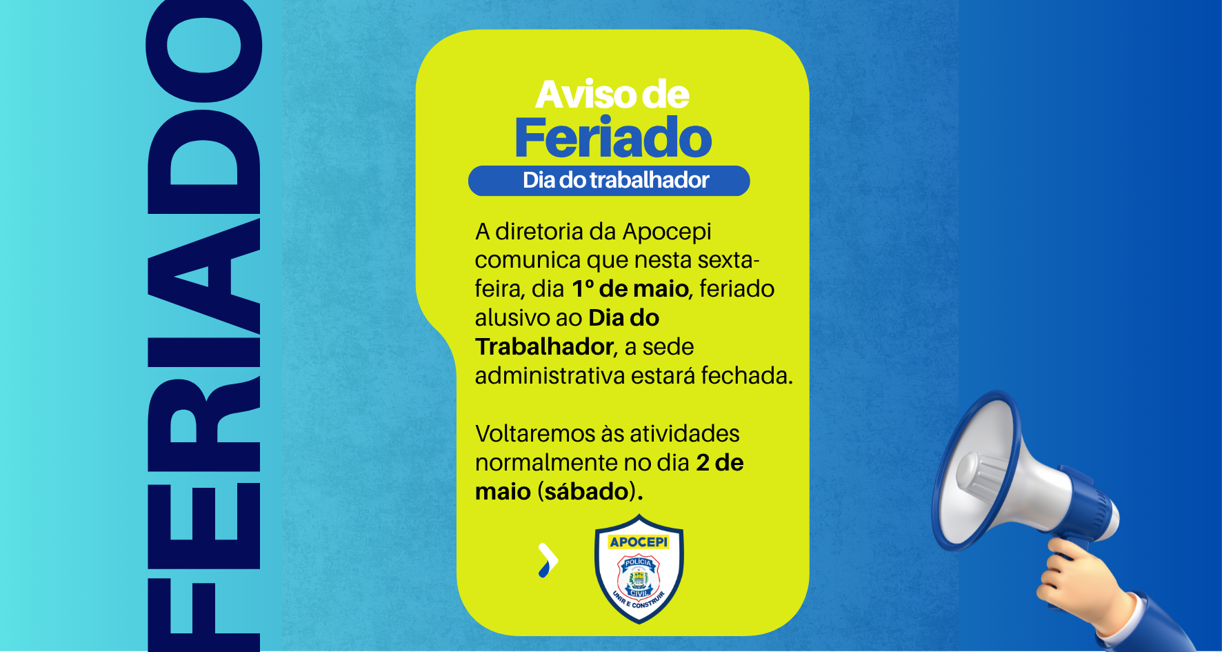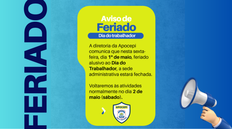 A diretoria da Apocepi comunica que nesta sexta-feira, dia 1º de maio, feriado alusivo ao Dia do Trabalhador, a sede administrativa estará fechada.