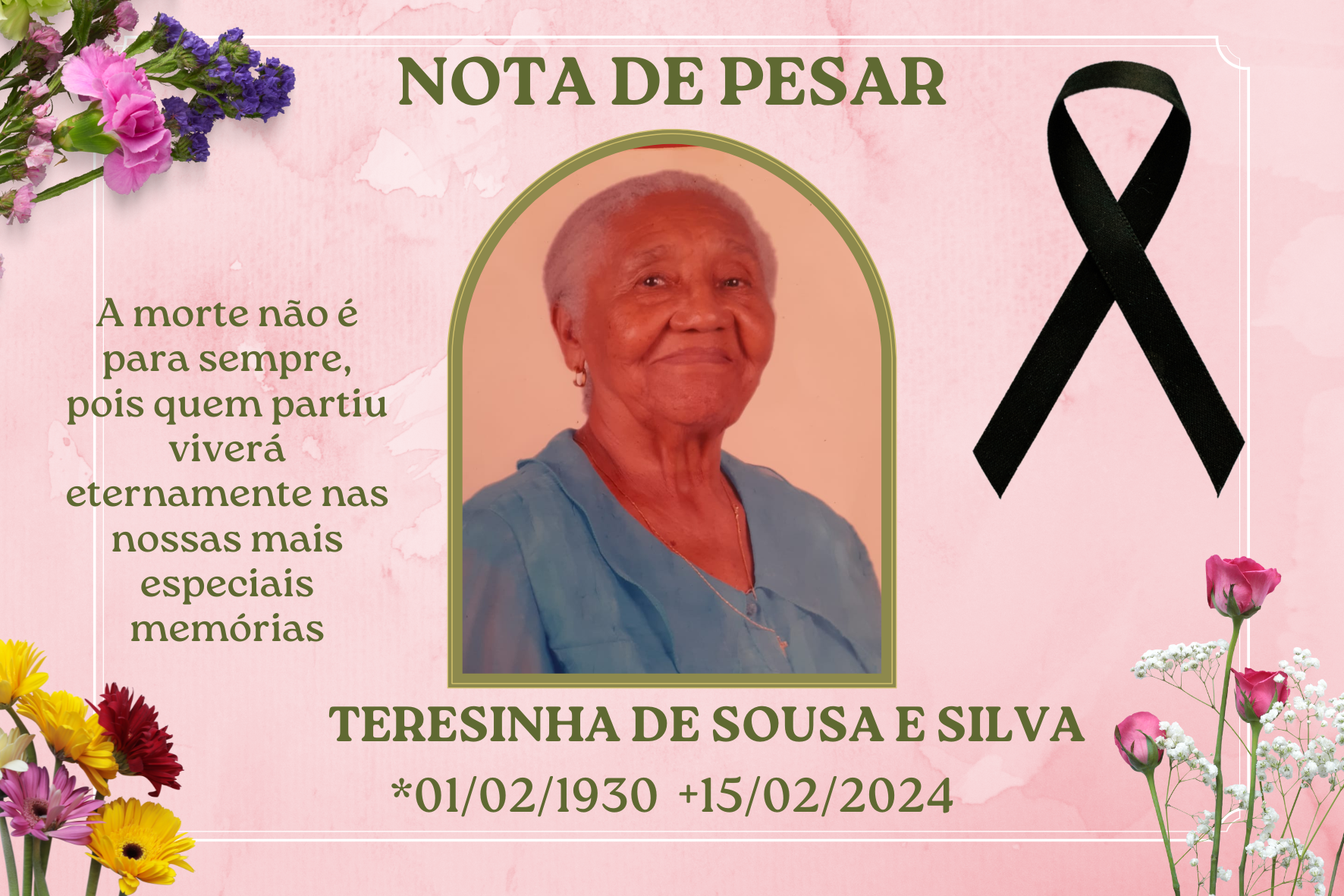 É com imenso pesar que a diretoria da Apocepi informa o falecimento da senhora Teresinha de Sousa e Silva, nessa manhã de quinta-feira, 15/02.