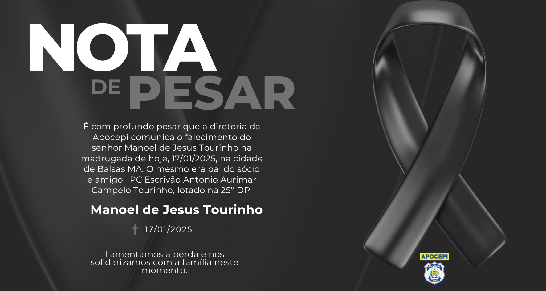 É com profundo pesar que a diretoria da Apocepi comunica o falecimento do senhor Manoel de Jesus Tourinho na madrugada de hoje, 17/01/2025, na cidade de Balsas MA. O mesmo era pai do sócio e amigo, PC Escrivão Antonio Aurimar Campelo Tourinho, lotado na 25º DP.
